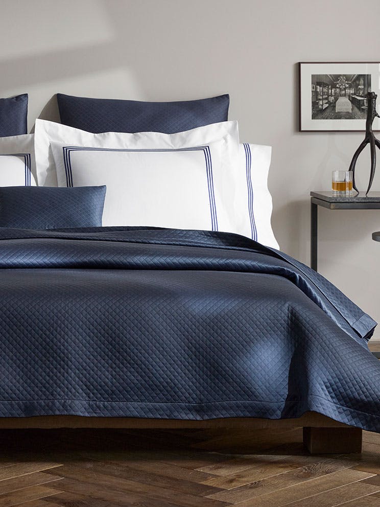 Our sumptuous Petra diamond matelassé now embellished with the iconic sateen tape border of our best-selling style, Lowell. With a subtle sheen and easy drape, these coverlets and shams offer an elevated finish to the bed all year round.